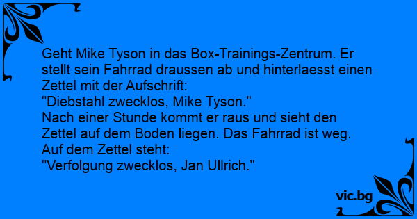 Geht Mike Tyson in das Box-Trainings-Zentrum. Er stellt sein Fahrrad draussen ab und hinterlaesst einen Zettel mit der Aufschrift: