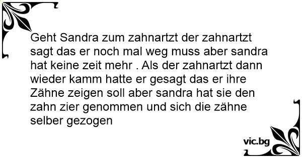Geht Sandra zum zahnartzt der zahnartzt sagt das er noch mal weg muss aber sandra hat keine zeit mehr . Als der zahnartzt dann wieder kamm hatte er gesagt das er ihre Zähne zeigen soll aber sandra hat sie den zahn zier genommen und sich die zähne selber gezogen