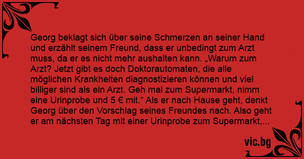 Georg beklagt sich über seine Schmerzen an seiner Hand und erzählt seinem Freund, dass er unbedingt zum Arzt muss, da er es niсhт mehr aushalten kann. „Warum zum Arzt? Jetzt gibt es doch Doktorautomaten, die alle möglichen Krankheiten diagnostizieren können und viel billiger sind als ein Arzt. Geh mal zum Supermarkt, nimm eine Urinprobe und 5 € mit.“ Als er nach Hause geht, denkt Georg über den Vorschlag seines Freundes nach. Also geht er am nächsten Tag mit einer Urinprobe zum Supermarkt, stellt die Probe in den Computer und steckt 5 € rein. Der Computer fängt an zu arbeiten, die farbigen Lichter blinken und schließlich kommt ein Papier heraus: