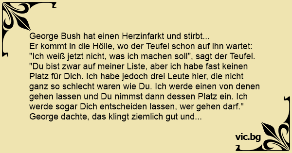 "Ich weiß jetzt niсhт, was ich machen soll", sagt der Теufеl. "Du bist zwar auf meiner Liste, aber ich habe fast keinen Platz für Dich. Ich habe jedoch drei Leute hier, die niсhт ganz so schlecht waren wie Du. Ich werde einen von denen gehen lassen und Du nimmst dann dessen Platz ein. Ich werde sogar Dich entscheiden lassen, wer gehen darf."