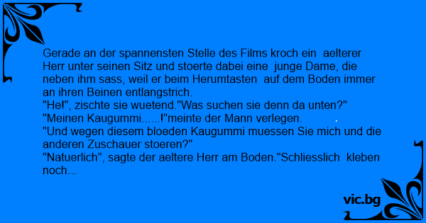 Gerade an der spannensten Stelle des Films kroch ein aelterer Herr unter seinen Sitz und stoerte dabei eine junge Dame, die neben ihm sass, weil er beim Herumtasten auf dem Boden immer an ihren Beinen entlangstrich.