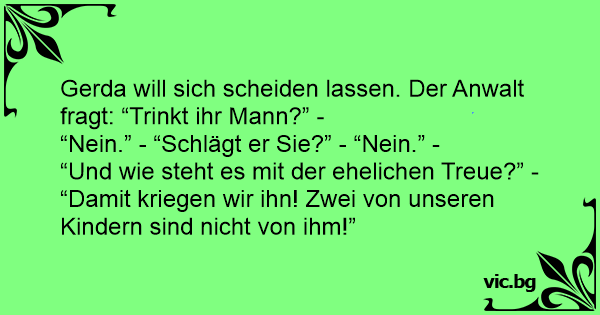 Gerda will sich scheiden lassen. Der Anwalt fragt: “Trinkt ihr Mann?” -