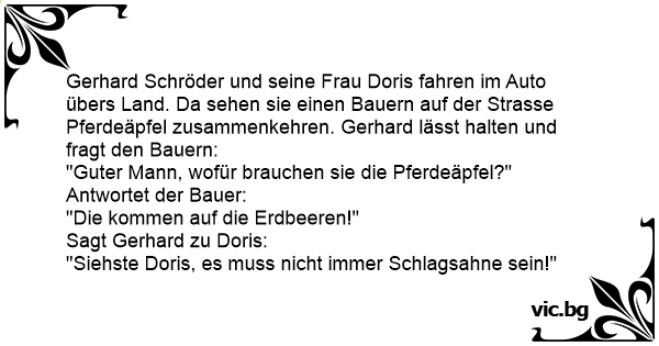 Gerhard Schröder und seine Frau Doris fahren im Auto übers Land. Da sehen sie einen Bauern auf der Strasse Pferdeäpfel zusammenkehren. Gerhard lässt halten und fragt den Bauern: