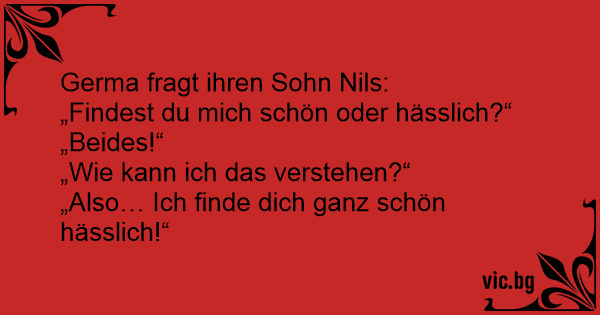 Birgitt fragt Ihren Sohn Paul: "Findest du mich schön oder hässlich?" Sagt der Sohn: "Eigentlich Beides". Verwundert fragt die Mutter nach: " Wie soll ich das den jetzt verstehen?" Sagt der Sohn: "...