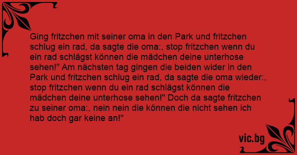 Ging fritzchen mit seiner oma in den Park und fritzchen schlug ein rad, da sagte die oma:, stop fritzchen wenn du ein rad schlägst können die mädchen deine unterhose sehen!" Am nächsten tag gingen die beiden wider in den Park und fritzchen schlug ein rad, da sagte die oma wieder:, stop fritzchen wenn du ein rad schlägst können die mädchen deine unterhose sehen!" Doch da sagte fritzchen zu seiner oma:, nein nein die können die niсhт sehen ich hab doch gar keine an!"