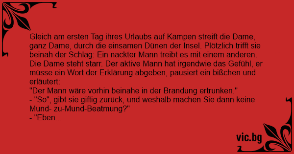 Gleich am ersten Tag ihres Urlaubs auf Kampen streift die Dame, ganz Dame, durch die einsamen Dünen der Insel. Plötzlich trifft sie beinah der Schlag: Ein nackter Mann treibt es mit einem anderen. Die Dame steht starr. Der aktive Mann hat irgendwie das Gefühl, er müsse ein Wort der Erklärung abgeben, pausiert ein bißchen und erläutert: