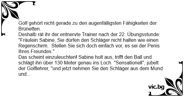 Eine Blondine macht einen Golfkurs. Der Golflehrer rät ihr, Den Golfschläger nicht so verkrampft festzuhalten: "Versuchen Sie sich mal vorzustellen, es ist das beste Teil Ihres Freundes." Die...