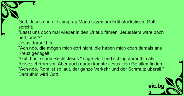 "Gut, hast schon Recht Jesus." sage Gott und schlug daraufhin als Reiseziel Rom vor. Aber auch daran konnte Jesus kein Gefallen finden. "Ach nöö, Rom ist so laut, der ganze Verkehr und der Schmutz überall."
