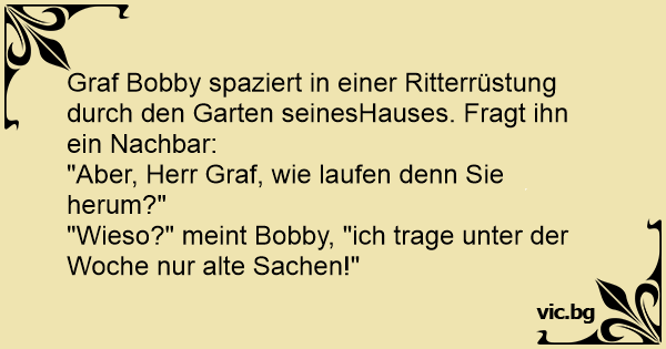 Graf Bobby spaziert in einer Ritterrüstung durch den Garten seinesHauses. Fragt ihn ein Nachbar: