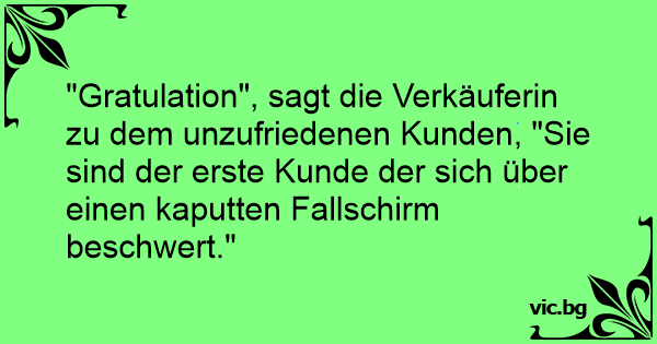 "Gratulation", sagt die Verkäuferin zu dem unzufriedenen Kunden, "Sie sind der erste Kunde der sich über einen kaputten Fallschirm beschwert."