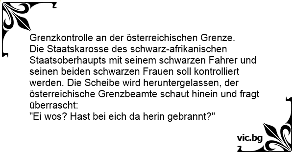 Die Staatskarosse des schwarz-afrikanischen Staatsoberhaupts mit seinem schwarzen Fahrer und seinen beiden schwarzen Frauen soll kontrolliert werden. Die Scheibe wird heruntergelassen, der österreichische Grenzbeamte schaut hinein und fragt überrascht: