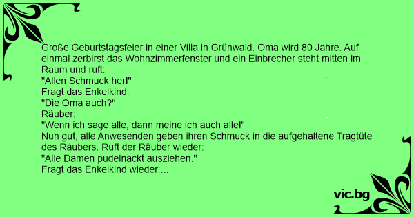 Große Geburtstagsfeier in einer Villa in Grünwald. Oma wird 80 Jahre. Auf einmal zerbirst das Wohnzimmerfenster und ein Einbrecher steht mitten im Raum und ruft: