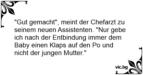 "Gut gemacht", meint der Chefarzt zu seinem neuen Assistenten. "Nur gebe ich nach der Entbindung immer dem Baby einen Klaps auf den Po und niсhт der jungen Mutter."