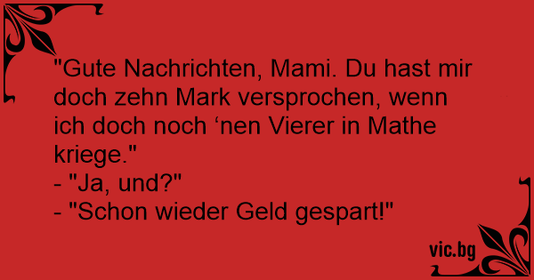 "Gute Nachrichten, Mami. Du hast mir doch zehn Mark versprochen, wenn ich doch noch ‘nen Vierer in Mathe kriege."