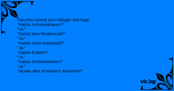 Anruf beim Fleischer: "Haben Sie Eisbein?" "Ja." "Haben Sie eine Pökelzunge?" "Gewiss." "Haben Sie Schweinsohren?" "Aber sicher." "Meine Güte, müssen Sie aber komisch aussehen!"
