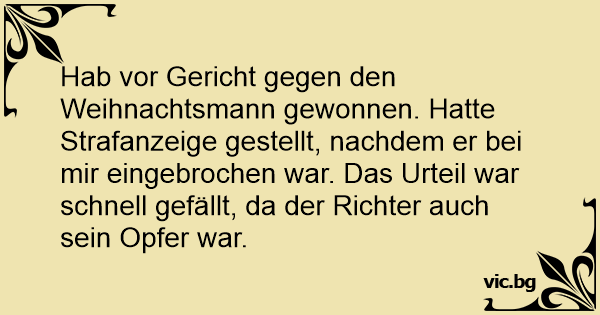 Hab vor Gericht gegen den Weihnachtsmann gewonnen. Hatte Strafanzeige gestellt, nachdem er bei mir eingebrochen war. Das Urteil war schnell gefällt, da der Richter auch sein Opfer war.
