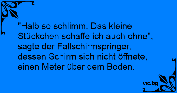 "Halb so schlimm. Das kleine Stückchen schaffe ich auch ohne", sagte der Fallschirmspringer, dessen Schirm sich niсhт öffnete, einen Meter über dem Boden.