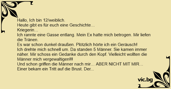 Ich drehte mich schnell um. Da standen 5 Männer. Sie kamen immer näher. Mir schoss ein Gedanke durch den Kopf. Vielleicht wollten die Männer mich vergewaltigen!!!