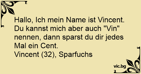 Hallo, Ich mein Name ist Vincent. Du kannst mich aber auch "Vin" nennen, dann sparst du dir jedes Mal ein Cent.
