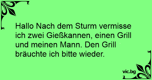 Hallo Nach dem Sturm vermisse ich zwei Gießkannen, einen Grill und meinen Mann. Den Grill bräuchte ich bitte wieder.