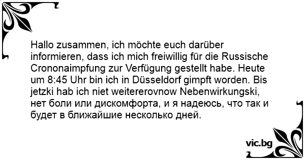 Hallo zusammen, ich möchte euch darüber informieren, dass ich mich freiwillig für die Russische Crononaimpfung zur Verfügung gestellt habe. Heute um 8:45 Uhr bin ich in Düsseldorf gimpft worden. Bis jetzki hab ich niet weitererovnow Nebenwirkungski, нет боли или дискомфорта, и я надеюсь, что так и будет в ближайшие несколько дней.