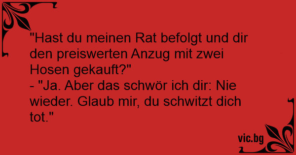 "Hast du meinen Rat befolgt und dir den preiswerten Anzug mit zwei Hosen gekauft?"
