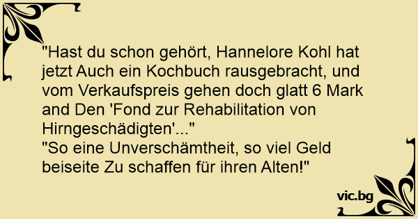 "Hast du schon gehört, Hannelore Kohl hat jetzt Auch ein Kochbuch rausgebracht, und vom Verkaufspreis gehen doch glatt 6 Mark and Den 'Fond zur Rehabilitation von Hirngeschädigten'..."