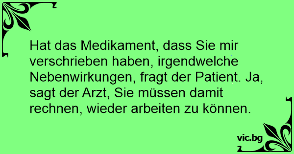 Hat das Medikament, dass Sie mir verschrieben haben, irgendwelche Nebenwirkungen, fragt der Patient. Ja, sagt der Arzt, Sie müssen damit rechnen, wieder arbeiten zu können.