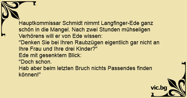 Hauptkommissar Schmidt nimmt Langfinger-Ede ganz schön in die Mangel. Nach zwei Stunden mühseligen Verhörens will er von Ede wissen: