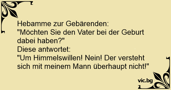 Ο πατέρας του παιδιού - Бащата ще присъства ли на раждането? Kurz vor der Geburt, Hebamme fragt die werdende Mutter: "Und wünschen Sie, dass der Vater bei der Geburt dabei ist?" Werdende Mutter: "Um Gottes Willen nein, mein Mann kann ihn absolut nicht leiden!"