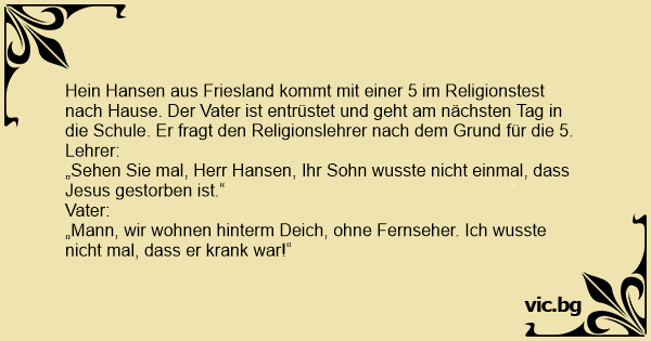 Hein Hansen aus Friesland kommt mit einer 5 im Religionstest nach Hause. Der Vater ist entrüstet und geht am nächsten Tag in die Schule. Er fragt den Religionslehrer nach dem Grund für die 5.