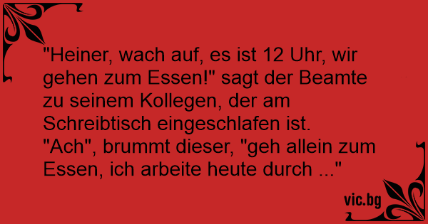 "Heiner, wach auf, es ist 12 Uhr, wir gehen zum Essen!" sagt der Beamte zu seinem Kollegen, der am Schreibtisch eingeschlafen ist.