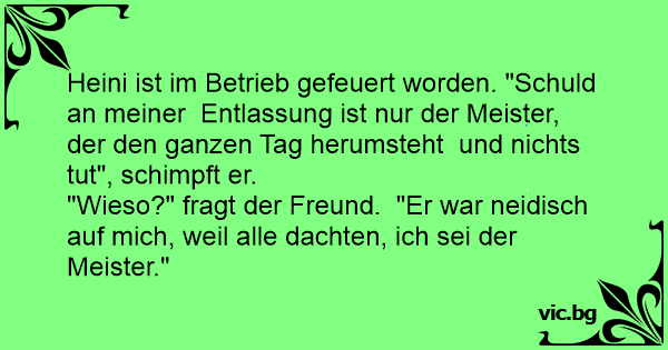 Heini ist im Betrieb gefeuert worden. "Schuld an meiner Entlassung ist nur der Meister, der den ganzen Tag herumsteht und nichts тuт", schimpft er.