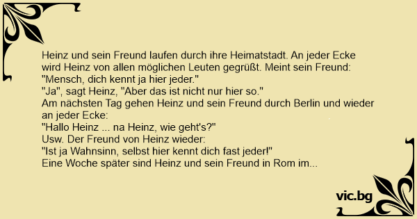 Heinz und sein Freund laufen durch ihre Heimatstadt. An jeder Ecke wird Heinz von allen möglichen Leuten gegrüßt. Meint sein Freund: