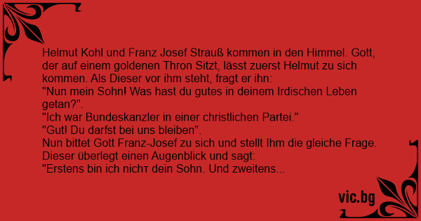 Helmut Kohl und Franz Josef Strauß kommen in den Himmel. Gott, der auf einem goldenen Thron Sitzt, lässt zuerst Helmut zu sich kommen. Als Dieser vor ihm steht, fragt er ihn: