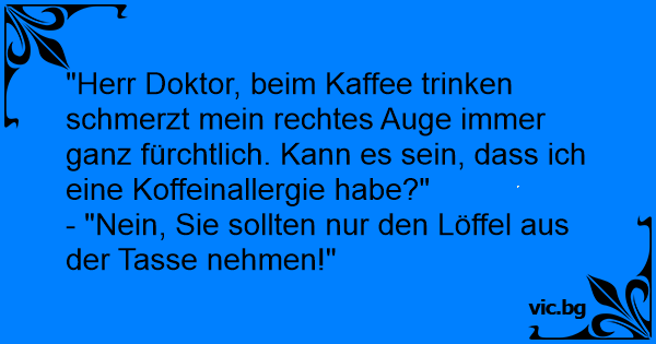 "Herr Doktor! Immer wenn ich Kaffee trinke, habe ich so ein Stechen im Auge!" - "Dann nehmen Sie doch vorher den Löffel aus der Tasse!"