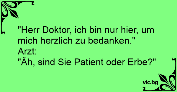 Ein Mann zum Arzt: "Herr Doktor, ich möchte ihnen meine ganze Dankbarkeit aussprechen!" Der Arzt: "Als Patient oder als Erbe?"