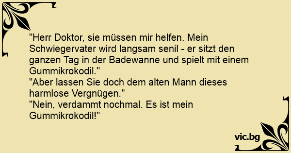 "Herr Doktor, sie müssen mir helfen. Mein Schwiegervater wird langsam senil - er sitzt den ganzen Tag in der Badewanne und spielt mit einem Gummikrokodil."