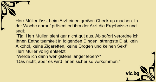 "Tja, Herr Müller, sieht gar niсhт gut aus. Ab sofort verordne ich Ihnen Enthaltsamkeit in folgenden Dingen: strengste Diät, kein Alkohol, keine Zigaretten, keine Drogen und keinen Sеx!"