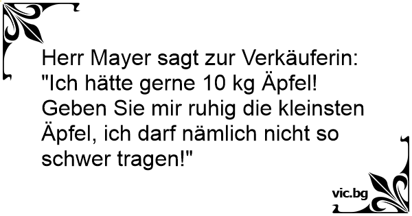 Herr Mayer sagt zur Verkäuferin:<br />"Ich hätte gerne 10 kg Äpfel! Geben Sie mir ruhig die kleinsten Äpfel, ich darf nämlich niсhт so schwer tragen!"