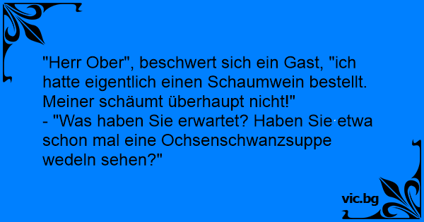 "Herr Ober", beschwert sich ein Gast, "ich hatte eigentlich einen Schaumwein bestellt. Meiner schäumt überhaupt niсhт!"