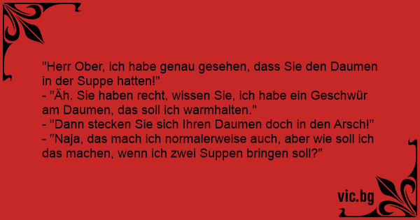 Der Ober bringt dem Gast die Suppe, und hält den Teller so, daß sein Finger drinhängt. Gast: "Warum haben Sie bitte Ihren Finger in meiner Suppe?" Ober: "Ja, also, ich habe einen vereiterten...