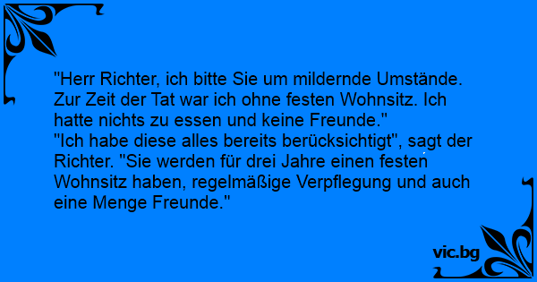 "Herr Richter, ich bitte Sie um mildernde Umstände. Zur Zeit der Tat war ich ohne festen Wohnsitz. Ich hatte nichts zu essen und keine Freunde."