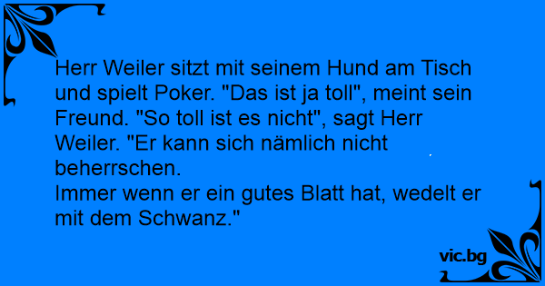Herr Weiler sitzt mit seinem Hund am Tisch und spielt Poker. "Das ist ja toll", meint sein Freund. "So toll ist es niсhт", sagt Herr Weiler. "Er kann sich nämlich niсhт beherrschen.