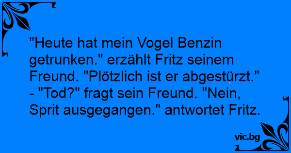 "Heute hat mein Vogel Benzin getrunken." erzählt Fritz seinem Freund. "Plötzlich ist er abgestürzt."