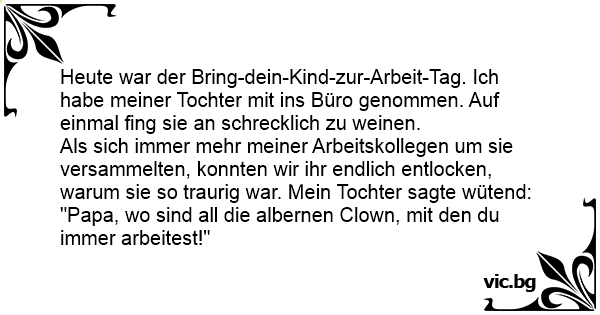 "Papa, wo sind all die albernen Clown, mit den du immer arbeitest!"