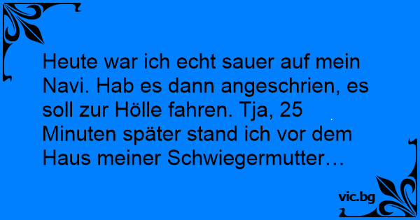Heute war ich echt sauer auf mein Navi. Hab es dann angeschrien, es soll zur Hölle fahren. Tja, 25 Minuten später stand ich vor dem Haus meiner Schwiegermutter…