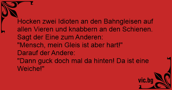 Hocken zwei Idioten an den Bahngleisen auf allen Vieren und knabbern an den Schienen. Sagt der Eine zum Anderen: