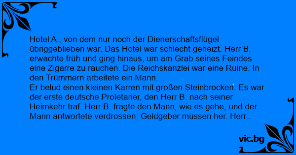 Hotel A., von dem nur noch der Dienerschaftsflügel übriggeblieben war. Das Hotel war schlecht geheizt. Herr B. erwachte früh und ging hinaus, um am Grab seines Feindes eine Zigarre zu rauchen. Die Reichskanzlei war eine Ruine. In den Trümmern arbeitete ein Mann.