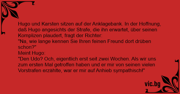 Hugo und Karsten sitzen auf der Anklagebank. In der Hoffnung, daß Hugo angesichts der Strafe, die ihn erwartet, über seinen Komplizen plaudert, fragt der Richter: